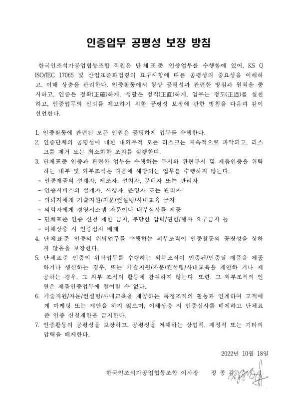 단체표준 인증업무 공평성 보장 방침 최고관리자 0 553 2023.06.14 11:20 2024.06.26 10:36 공평성보장방침.pdf (53.6K) + 8 2024.06.26 10:37 공평성보장방침_1.png (116.1K) + 4 단체표준 인증업무 공평성 보장 방침
