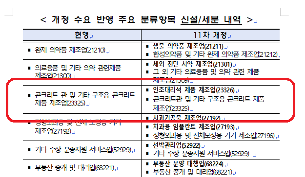 - 통합화: 기존 산업 분류의 콘크리트 제조업(23325),기타 플라스틱(22299),기타 석제품(23919) 등에 흩어져 있던 인조석 혹은 인조대리석 관련 코드는 모두 23326으로 통일하고 기존 내용은 삭제 함.