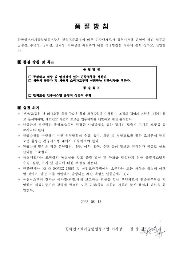 단체표준 품질방침 최고관리자 0 635 2023.06.14 11:12 2024.06.26 10:42 품질방침_1.png (95.3K) + 8 2024.06.26 10:42 품질방침.pdf (70.1K) + 9 단체표준 품질방침