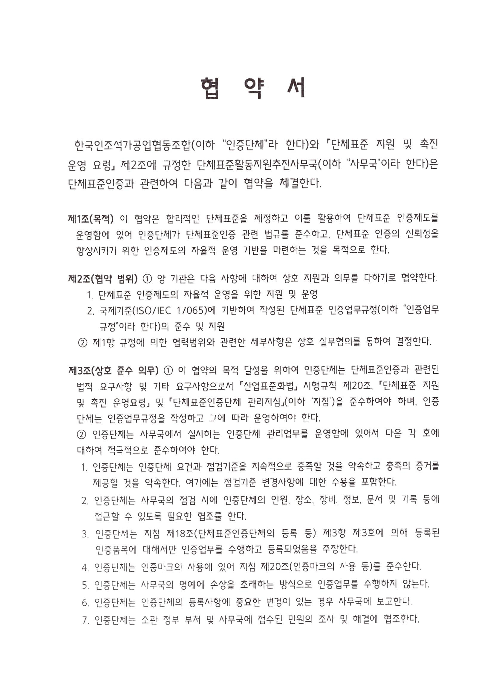 단체표준인증 경쟁력 강화를 위한 자율협력 업무협약서