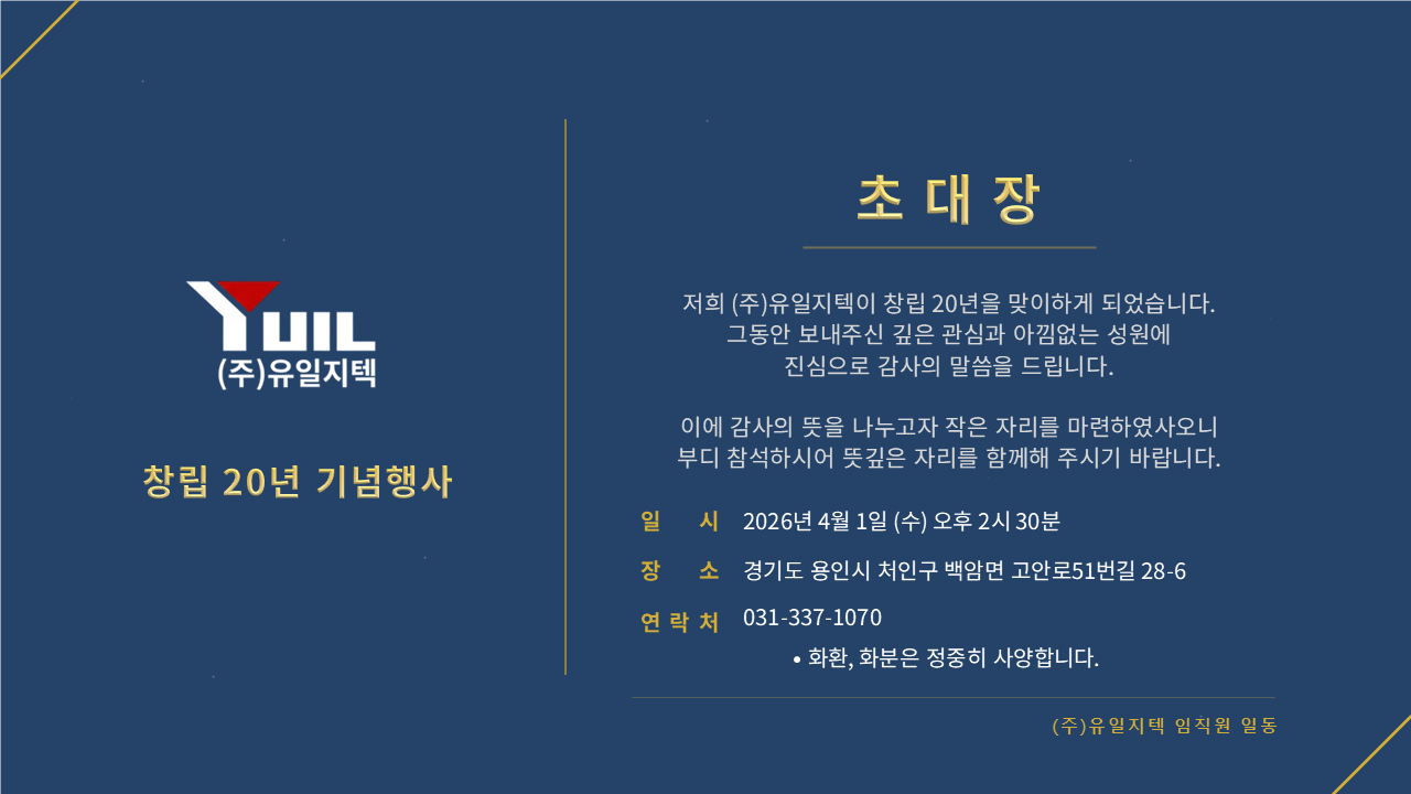 ㈜유일지텍 창립 20년 기념행사를 아래와 같이 하오니 참석하시어 뜻깊은 자리를 함께해 주시기 바랍니다.
